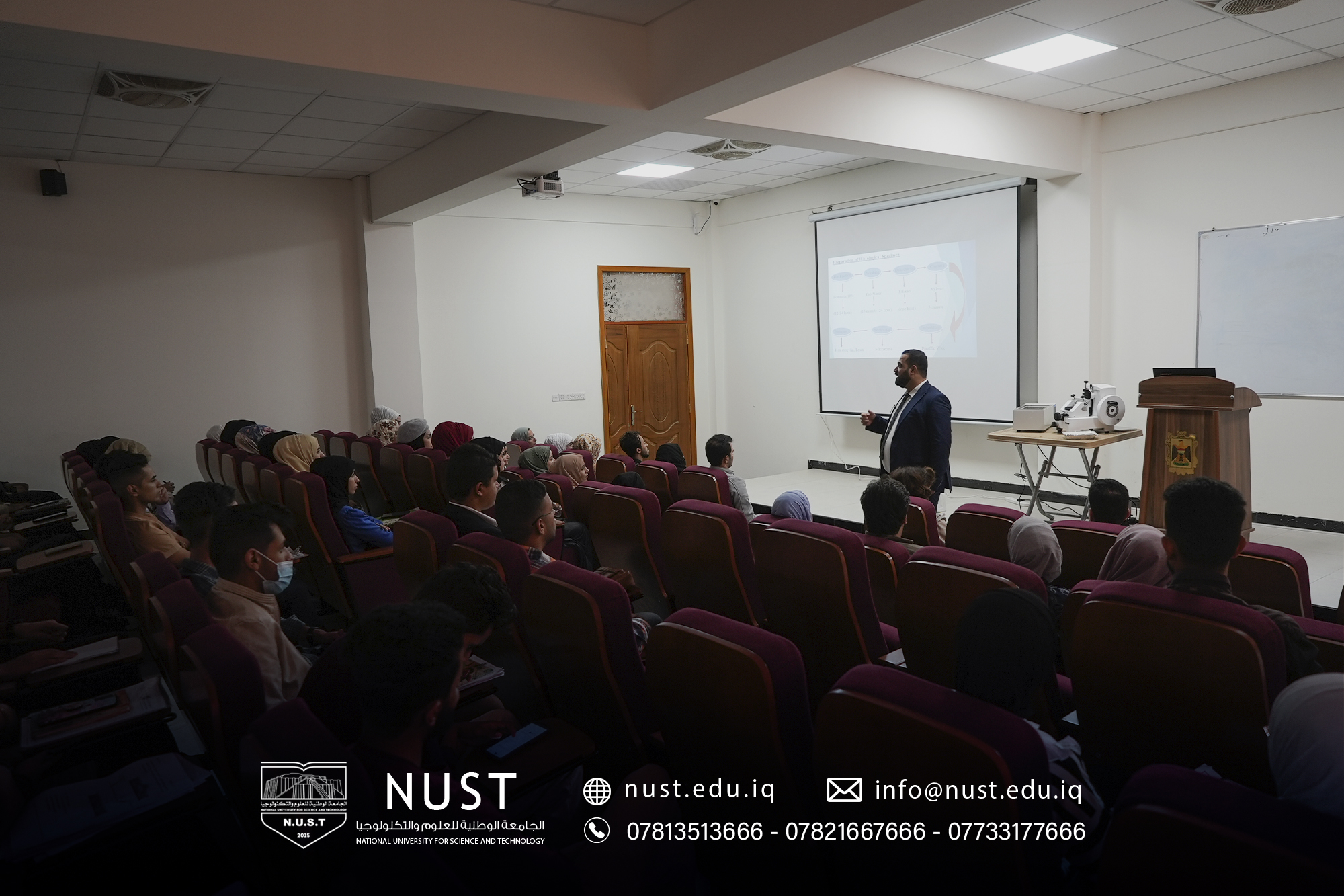 The Continuuing Education Center, in collaboration with the Department of Quality Assurance and Academic Accreditation at the National University of Science and Technology, organized an in-person workshop titled "Steps for Preparing Tissue Slides in the Laboratory". The workshop was presented by Dr. M. D. Nashat Ali Saud and took place on Sunday, November 27, 2022.