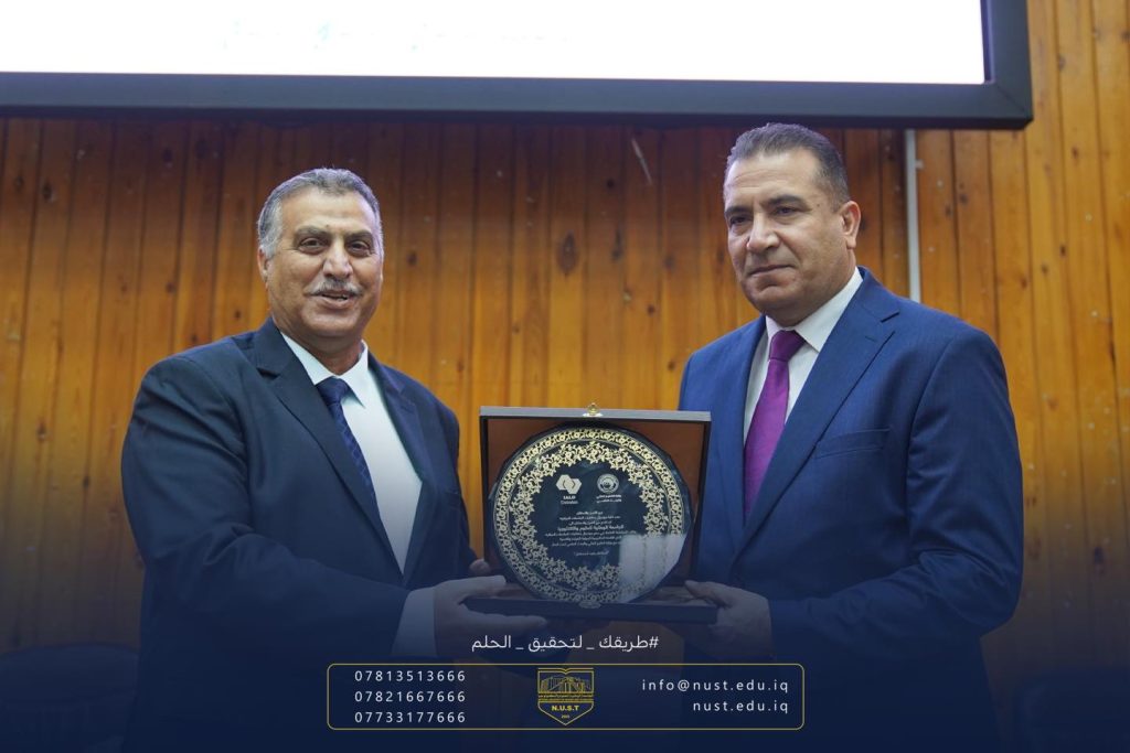 The respected advisor to the Minister of Higher Education and Scientific Research, Professor Dr. Alaa Abdul Hassan, honors the President of the National University, Professor Abdul Razzaq Laibi Al-Rubaie, in appreciation of the university's great efforts in supporting the scientific process.